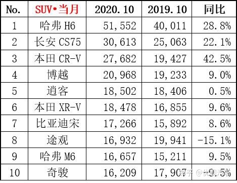 10月SUV销量前三仍以哈弗、长安、本田车型为主
