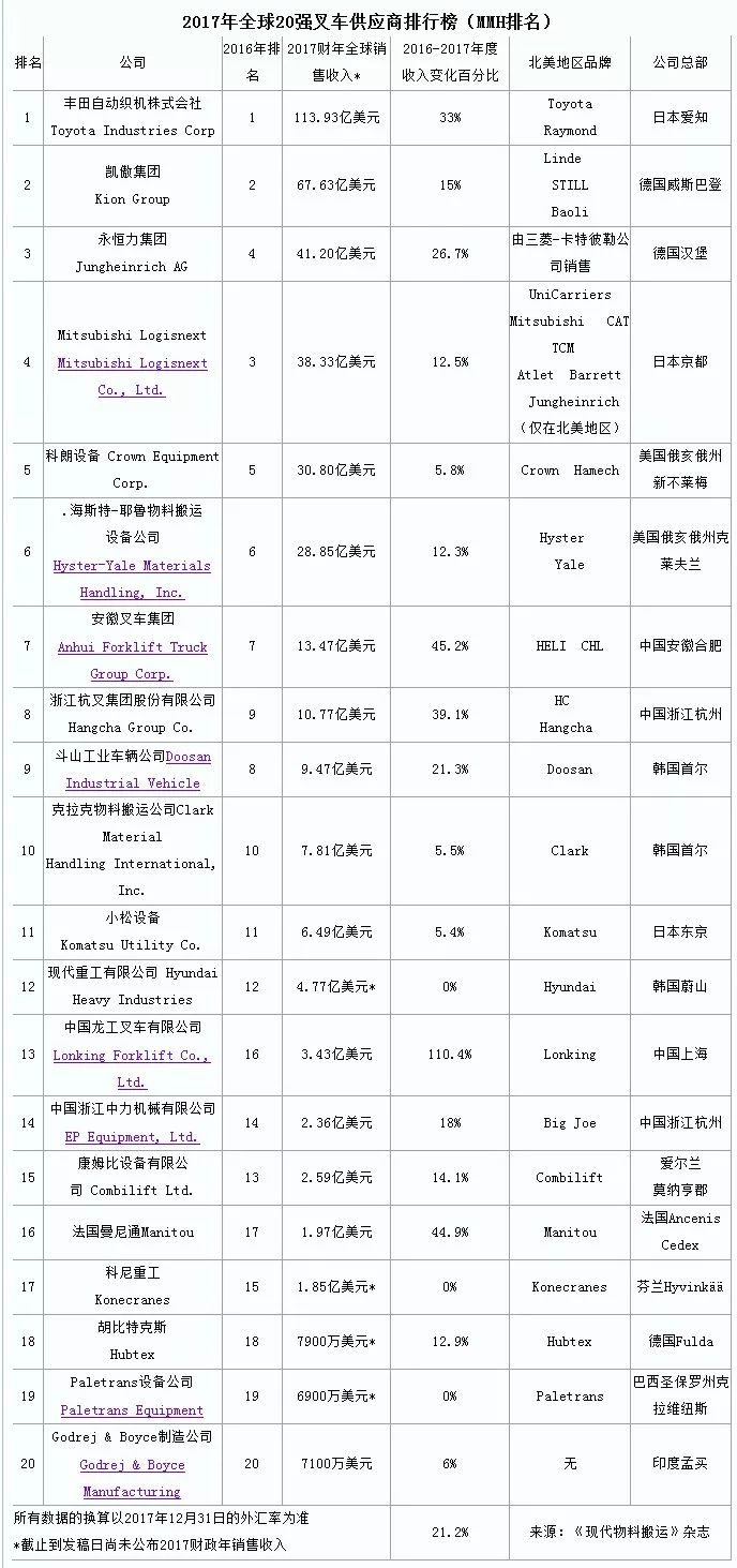 美国《现代物料搬运》杂志(简称MMH,以下简称《现代》杂志)20大叉车供应商年度榜单中的主要公司2017年总营收增长21%。