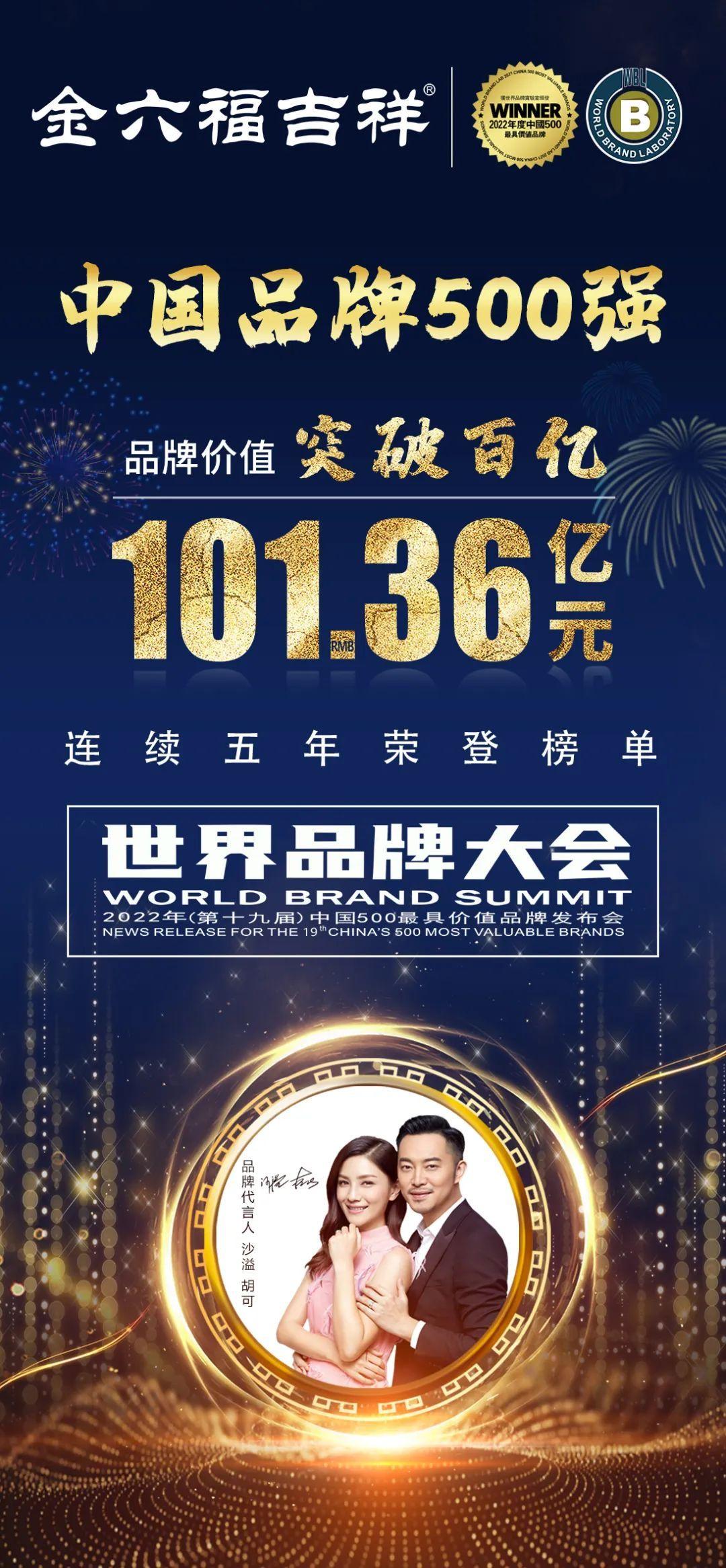 7月26日,由世界品牌实验室(World Brand Lab)主办的(第十九届)“世界品牌大会暨中国品牌500强大会”在北京中国大饭店盛大开幕。会上发布了2022年《中国500具价值品牌》分析报告。在这份基于财务数据、品牌实力和消费者行为分析的年报中,金六福吉祥连续五年跻身中国品牌500强,品牌价值突破百亿元,达到101.36亿元。