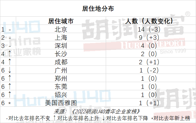 北京、上海、深圳仍是U40青年创业者集中的城市。北京多,有14个名额,比去年减少3个;上海以9位排名第二,比去年增加3位;深圳以4个名额位居第三,与去年持平。排名前三的城市占榜单的近80%。成都增加了1比2。他们是39岁的猫球科技的王明流和35岁的医联会的王诗瑞。该名单涵盖港澳台企业家,但均未上榜。