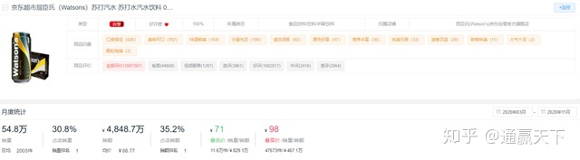 屈臣氏汽水在京东平台的销量极高。2020年3月至11月,京东平台累计销量达54.8万件,累计销售额4800万元,超过了众多品牌的大部分商品。该产品历史低价低至71元,高价98元。
