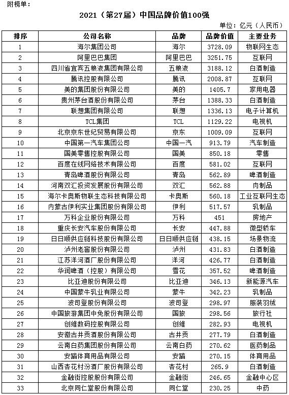 近日,2021年中国品牌价值百强榜单揭晓。榜单前5名的品牌分别是:海尔、阿里巴巴、五粮液、腾讯、美的。其中,海尔以3728.09亿元的市值连续20年蝉联榜单。,而在白酒行业中,五粮液连续27年位居第一,贵州茅台位居白酒第二位,位列榜单第六位。