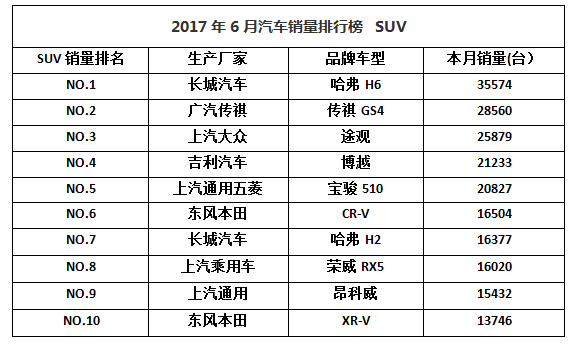 日前,乘联会发布了6月份SUV销量数据。2017年6月,SUV累计销量72.08万辆,同比增长17.7%,环比增长0.3%。买车整理了6月SUV轿车销量前十车型。