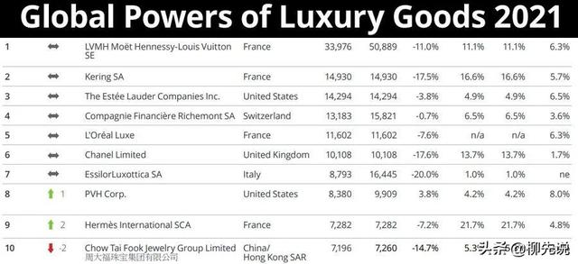 意大利的依视路排名第七,销售额为87.93亿美元。是一家专业从事眼镜制造和销售的跨国集团公司,拥有大的眼镜零售网络,其品牌为雷朋;香奈儿位列榜单第六位,年销售额101.08亿美元。该品牌拥有三大类产品:时尚精品店和配饰、香水、化妆品和护肤品以及手表/高级珠宝,已有 111 年的历史。