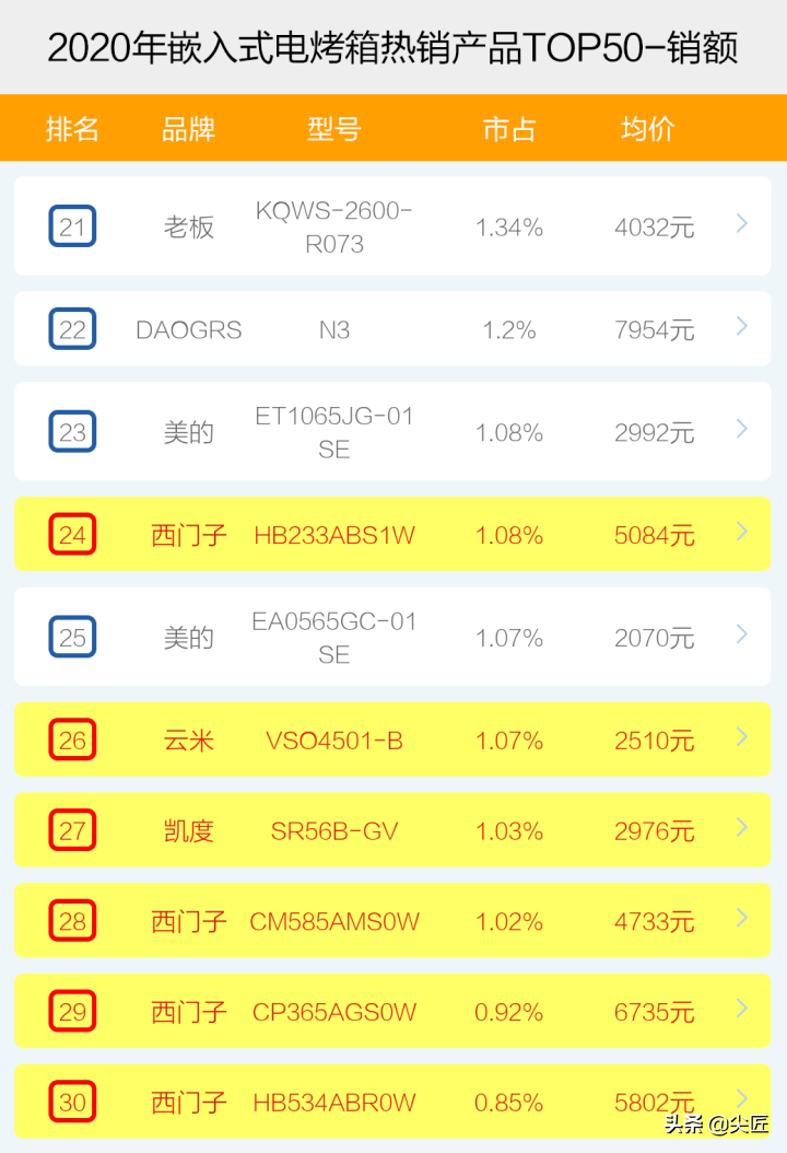 在2020年嵌入式电烤箱销售品牌排行榜中,美的位居第一,西门子、凯度、博士、苏泊尔、德普、华帝、惠而浦、方太分别位列2-10。