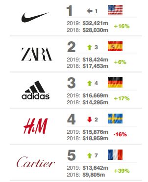 榜单前4名分别是运动品牌耐克、快时尚品牌Zara、运动品牌阿迪达斯、快时尚品牌H&M,其中ZARA已连续三年进入前三