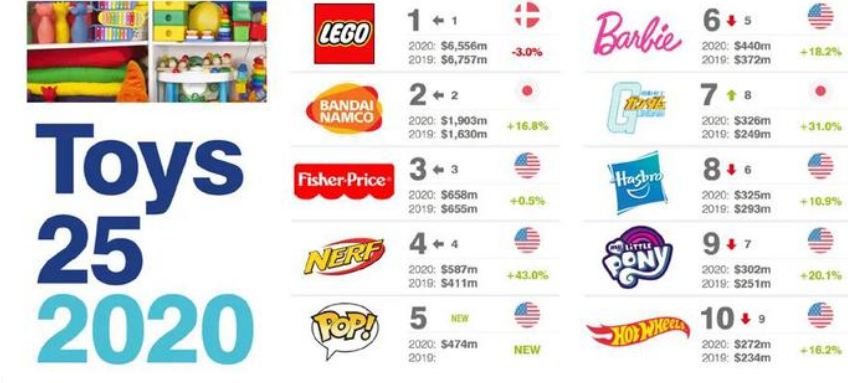 Brand是一家英国品牌资产评估机构,近日发布了“2020年25个具价值玩具品牌排行榜”(上)。在这份榜单中,丹麦乐高公司以67.57亿美元(479亿元人民币)的品牌价值位居第一。南梦宫和美泰的费舍尔分列第二和第三。此外,Nerf、孩之宝、小马宝莉、机动战士高达、风火轮和美泰分别位列第四至第十。特别是孩之宝有10个品牌入选,。万达广场的南梦宫排名第7世界品牌榜,美泰排名第5,但没有一个中国玩具品牌上榜,这确实不符合大玩具制造商的地位。