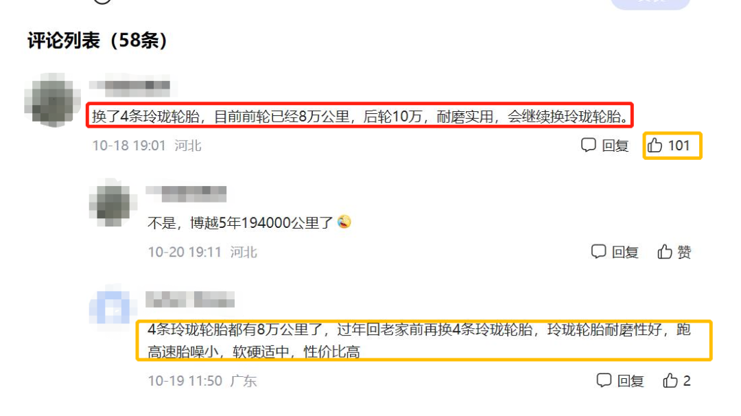 针对这条评论,另一位车友也跟随评论称,自己也更换了4条玲珑轮胎,行驶里程8万公里,过年回老家更换4条玲珑轮胎。玲珑轮胎在高速行驶时耐磨性好,轮胎噪音小,软硬适中,性价比高。