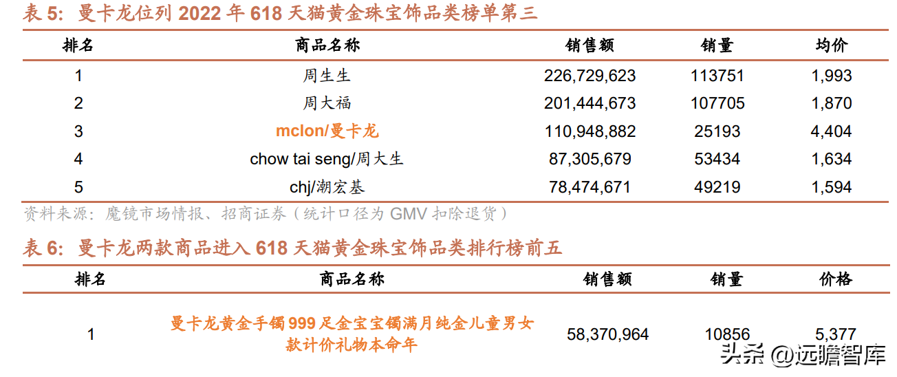 在2022年的天猫618活动中,曼卡龙取得了骄人的成绩。期内销售额突破1.1亿元,平均销售价格远高于同行业竞争对手。成功进入十大服装时尚品牌,位居天猫黄金首饰前三名,仅次于周生生和周大福,有两款产品在黄金首饰品类中排名前五。热门产品的强大竞争力。