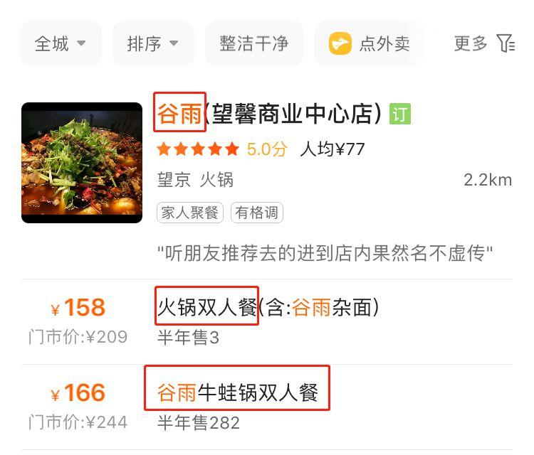 先来看一个案例:我在找火锅的时候,出来了一家叫谷雨的店。发生了什么?原来,在这家餐厅的二四人份的火锅餐中,竟然出现了“火锅”二字。为此,谷雨甚至在另一家火锅店门口排起了长队。