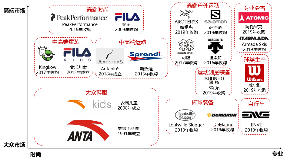 2009年以来,安踏不断收购国外知名运动品牌,进军新市场,完善产品矩阵。经过十余年的沉淀,2019年收购Amer后,已席卷大众和高端市场,涵盖休闲、专业和户外运动的所有品类。