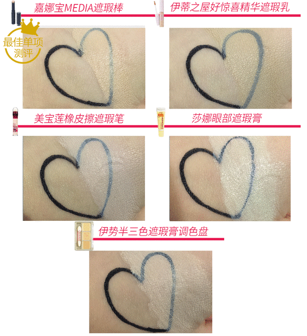 经过测试,嘉娜宝的遮瑕力度赞。能够较好的遮盖手背处的眼线。其他四款的遮瑕力度基本持平。