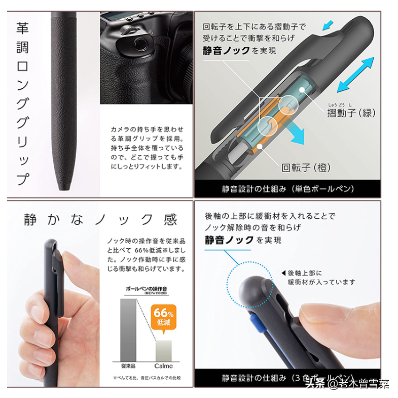 Calme是派通在圆珠笔领域的突破之作,外观上同样秉承了如今的极简风,不过笔握使用了人造革材质,这和相机防滑握持区的硬革是一样的,握持书写有质感。