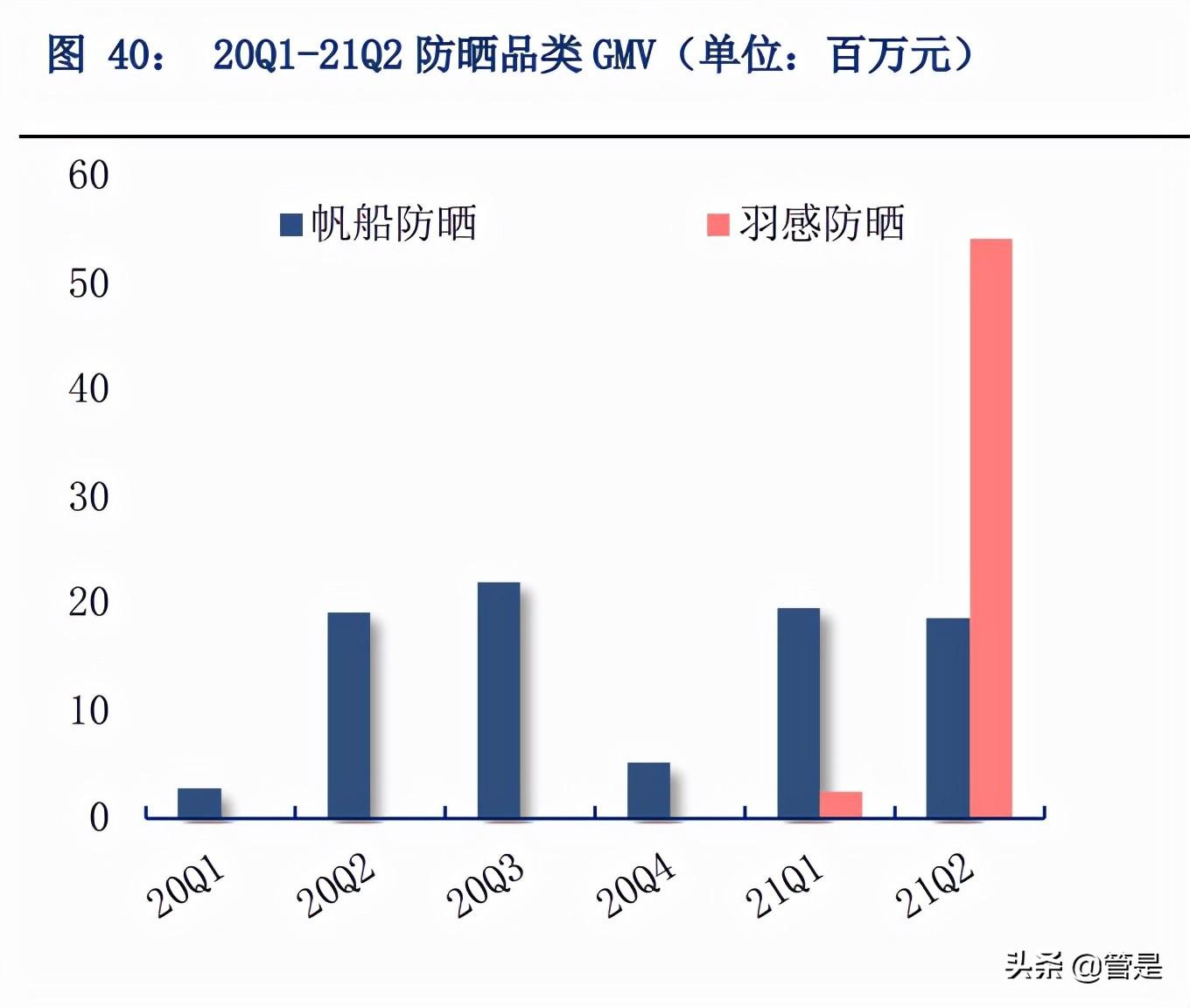 新款防晒品类已成爆款,中端粉底液产品仍在推广中。防晒霜方面,羽感防晒霜仅用一 个季度打造成爆款:根据天猫旗舰店数据,20 年公司帆船防晒霜产品 GMV 为 0.50 亿 元,占比旗舰店 GMV 比重为 3.6%,21H1 同款产品 GMV 为 0.08 亿元,占比旗舰店 GMV 比重为 5.0%,防晒类产品销售增长良好;而羽感防晒霜 21Q1 推出后,21H1 实现 GMV 为 0.57 亿元,占比旗舰店 GMV 比重为 7.4%,GMV 超过帆船防晒霜(考虑到定价 差异,销量并未显示出差异),借助防晒旺季,爆款产品打造成功。