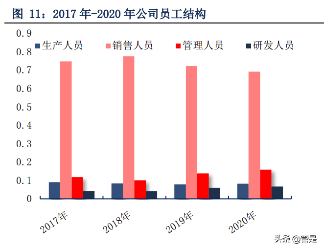 人均创收与人均薪酬双提升,高激励大力吸引优质管理、研发人才。截止 2020 年,公司 共有 2898 名员工,较 17 年增长 17%,公司大力吸引的管理人才与研发人才,管理 人员、研发人员较 17 年增长 57%、85%,人员占比提升幅度较大。伴随人员扩容,人均 创收及薪酬福利水平均有所提升,以 2020 年为例,公司综合人均薪酬较 17 年提升,管 理、研发人员人均薪酬较 19 年分别提升 12%、6%。此外,公司 2020 年人均创收达 129.5 万元/人,较 2017 年提升 80%,增长。