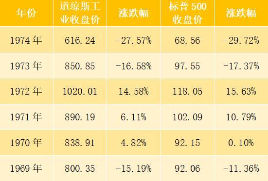 图表:1969至1974年间道琼斯工业、标普500年度涨跌幅