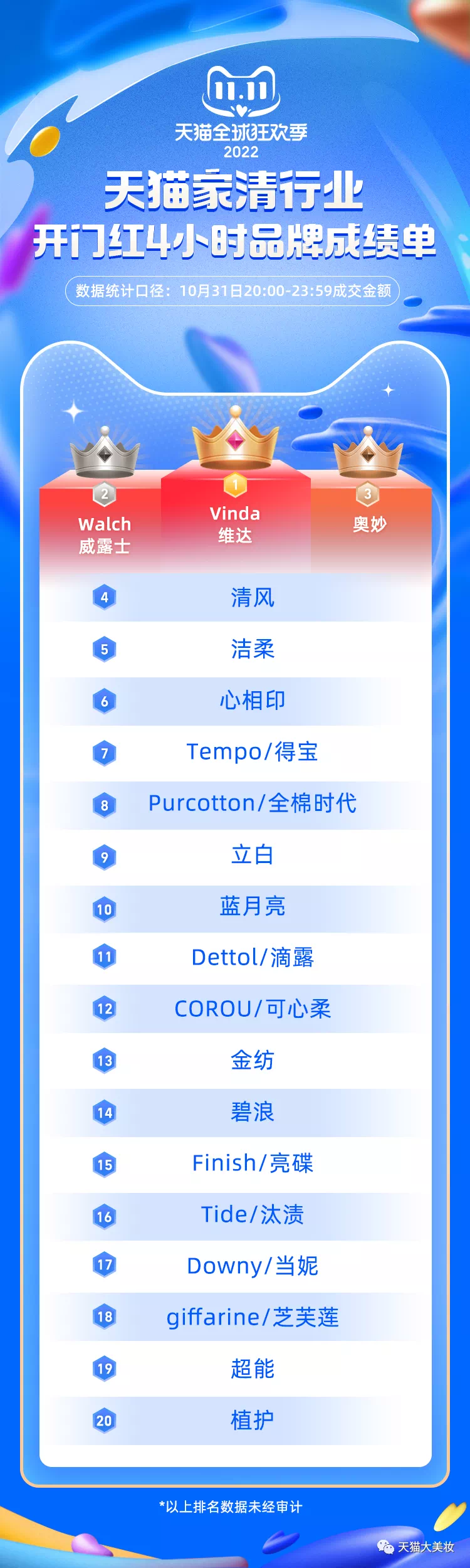 而家清榜单,维达、威露士和奥妙占去前三席位,立白、蓝月和超能等老牌国货也成功挤入前20榜单。