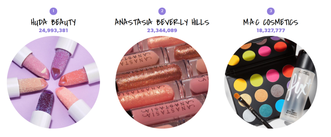 实际上,话题标签量多的前三个品牌与报告里整体排名前三的品牌(Huda Beauty,Anastasia Beverly Hills和MAC Cosmetics)完全一致。