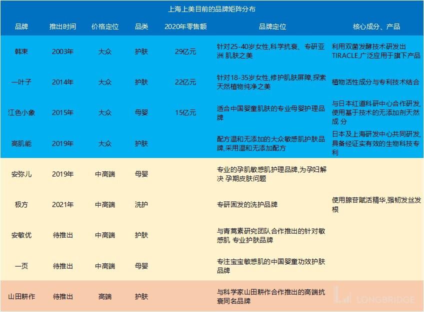 值得关注的是,上美集团近年推出的安弥儿、极方等品牌,则主打中高端产品,上美集团也将推出高端品牌上田耕作(以原 SK-II 科学家命名),作布局。长桥海豚君认为试水非大众化妆品市场,上美集团中高端、高端产品布局能否成功接力韩束、一叶子,目前还需要时间验证。