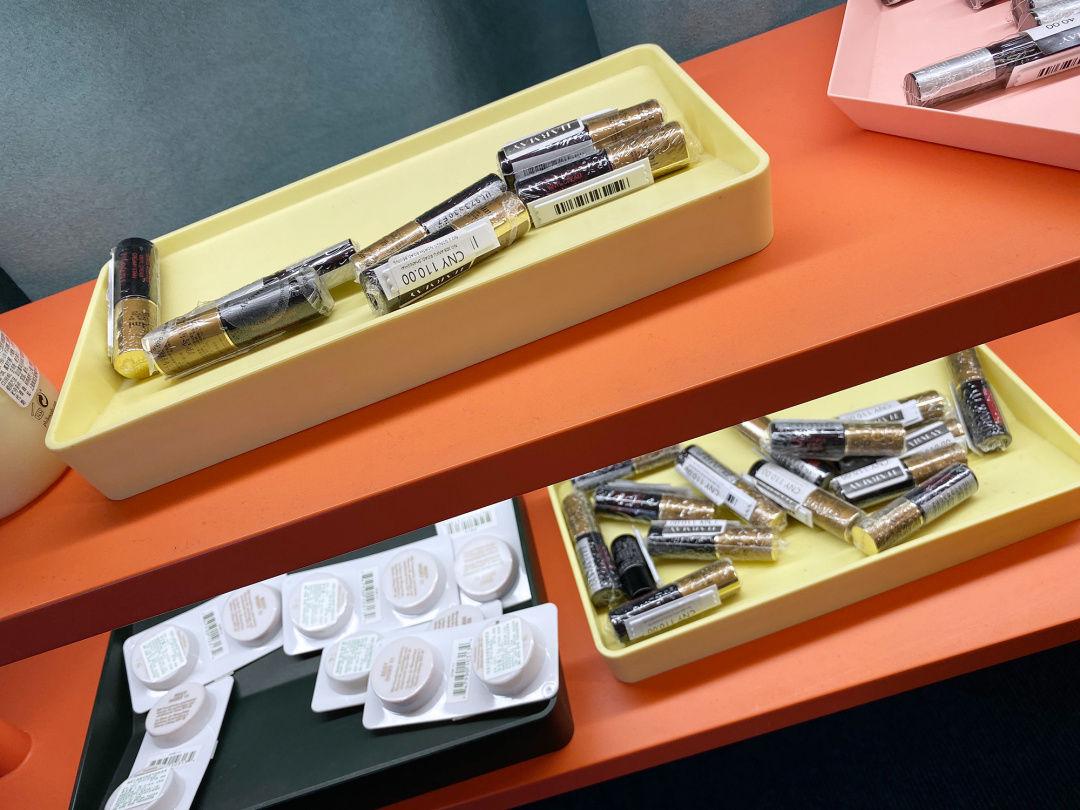 正对着门口的就是收款台,围绕着收款台的是各种各样的美妆产品,像是各种网红口红一应俱全,像是阿玛尼啦,dior啦,ysl啦,mac啦,tom ford啦,纪梵希啦,店员只是负责帮忙找色号,并不会多加干预,只要你的手够用,想试多少口红就能试多少。