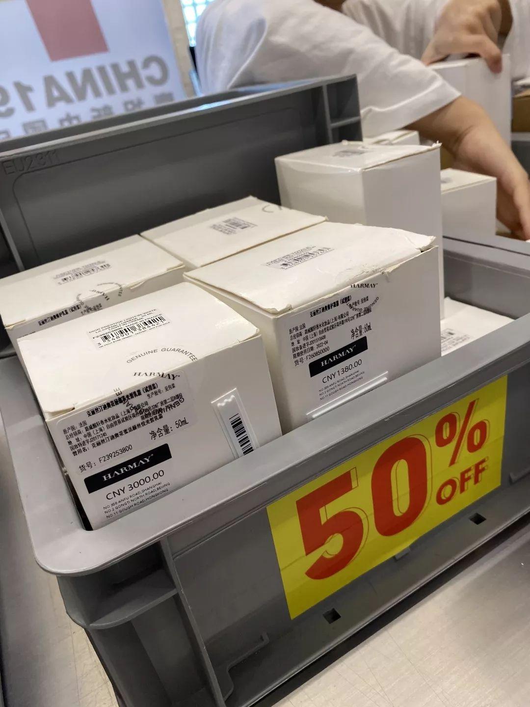 款台背面还有一个打折区,里面装的产品都是5折,包装算是比较差,就是普通的白色盒子用harmay的胶带封上,而且不少产品被标注是试用装,虽然是正装的size,想来大概是商场用来放在外面给客户试用的那种。