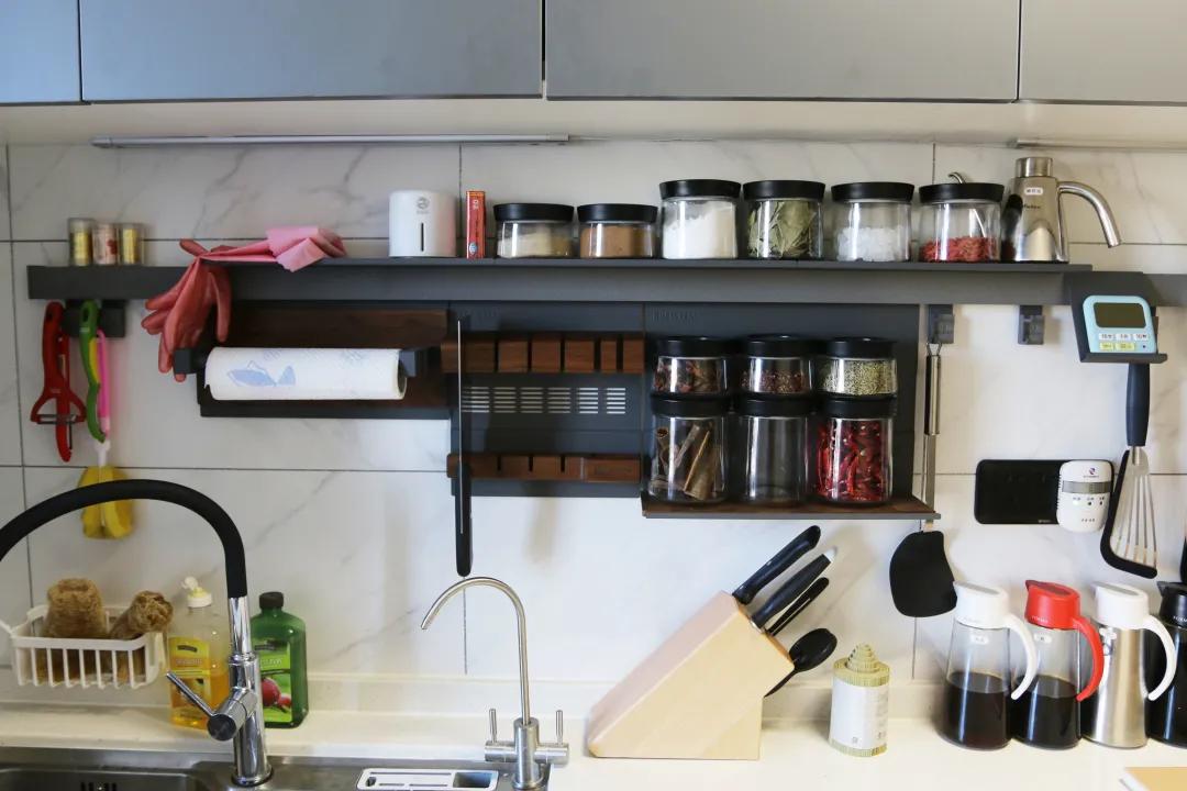 置物架放置油盐酱醋等杂物,磁吸实木刀架放置刀具,还有卷纸架、保鲜膜洁具架、磁吸调料架和独立挂钩等等,解放台面空间,厨房轻轻松松收纳得井然有序。