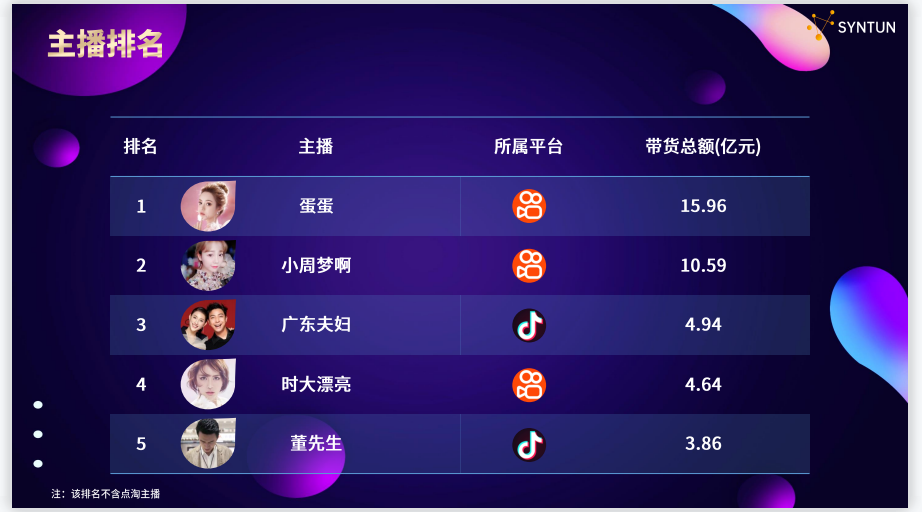 继淘系的薇娅、李佳琦消失在直播间后,今年618前夕,一度在抖音、快手风生水起的罗永浩和辛巴也相继宣布淡出直播间。今年618主播排名发生巨大变化,快手平台的“辛选当家花旦”蛋蛋以15.96亿元的带货总额,快手主播小周梦啊,以及抖音平台的广东夫妇带货总额分列第二、三名。