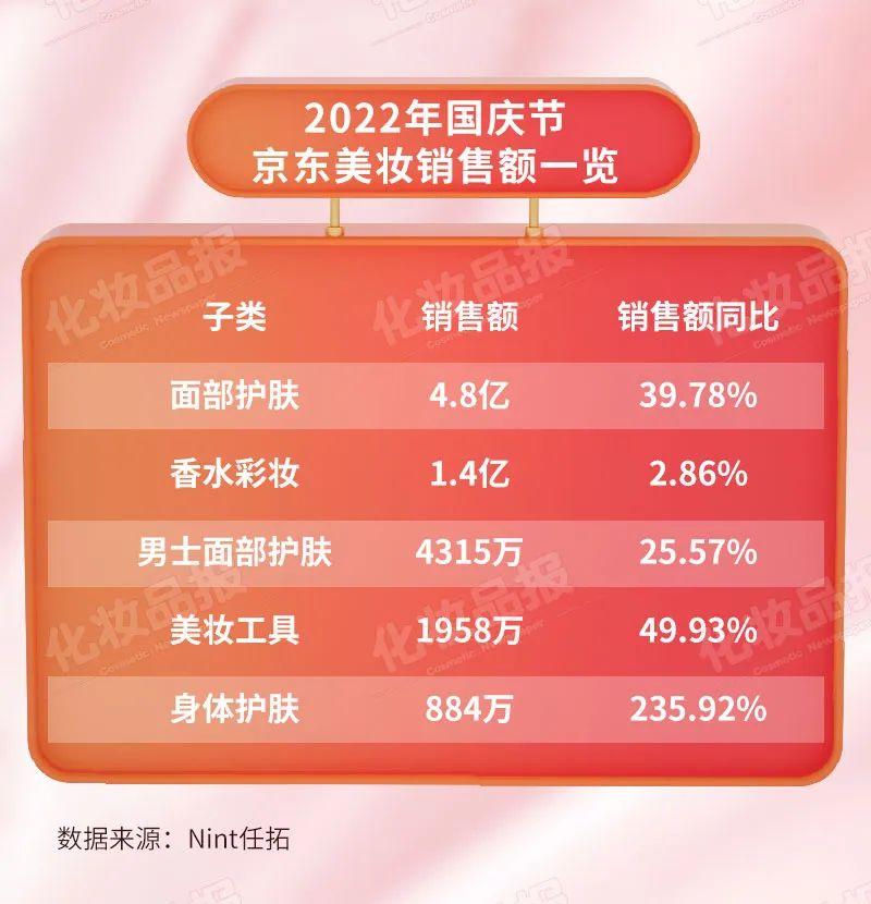 京东美妆全线上扬 SK-II/兰蔻/雅诗兰黛/资生堂/赫莲娜增长超3位数Nint任拓数据显示,京东美妆国庆小长假消费全线上扬,面部护肤类销售额较同期增长39.78%至4.8亿元,香水彩妆同比增长2.86%至1.4亿元,男士面部护肤同比增长25.57%至4315万元,美妆工具同比增长49.93%至1958万元,时逢秋末,气候干燥,身体护肤类需求大增,同比增长235.92%至884万元。