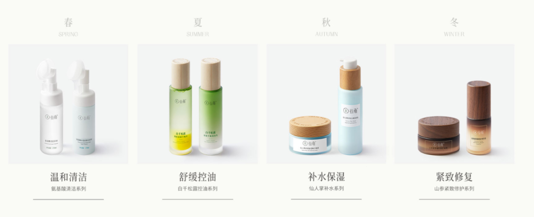 从产品研发到包装设计和宣发风格等方面,谷雨都在坚持传统文化的运用与输出。在产品研发上,谷雨陆续开发出了“光果甘草美白系列”、“氨基酸清洁系列”、“白千松露控油系列”、“仙人掌补水系列”、“山参紧致修护系列”等五大产品系列,围绕“功、植萃、文化”的品牌核心要素,研发出上百款SKU,满足了各种肤质的不同需求。