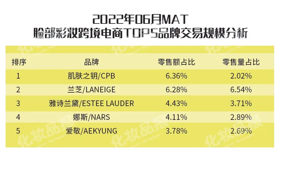 底妆跨境电商:CPB第一 兰芝第二数据显示,过去一年,跨境电商脸部彩妆前五强品牌分别为肌肤之钥、兰芝、雅诗兰黛、娜斯和爱敬。其中肌肤之钥CPB以零售额占比6.36%领跑,第二名兰芝以6.28%零售额占比紧随其后,后三名的零售额占比分别为4.43%、4.11%、3.78%。