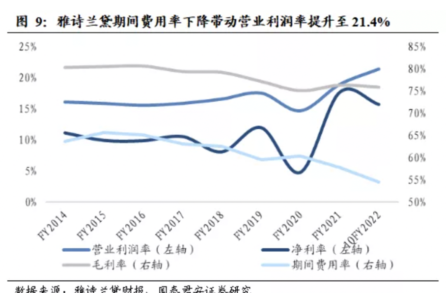 就在去年11月,雅诗兰黛于2022财年Q1财报中提到,运输和物流成本的上升将对销售成本和运营费用产生负面影响。另据国君证券的统计,彼时雅诗兰黛的毛利率微降至75.93%,净利率虽微增至15.75%,但离历史好水平仍有距离。