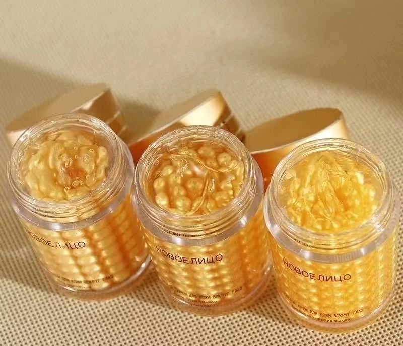 金眼霜的护肤功以为眼周肌肤赋能,提拉紧致为主。它的产品形式与一般的霜膏体不同,金色颗粒排列在瓶中,使用前搅拌挖取适量在指尖揉开,按压在眼周即可。