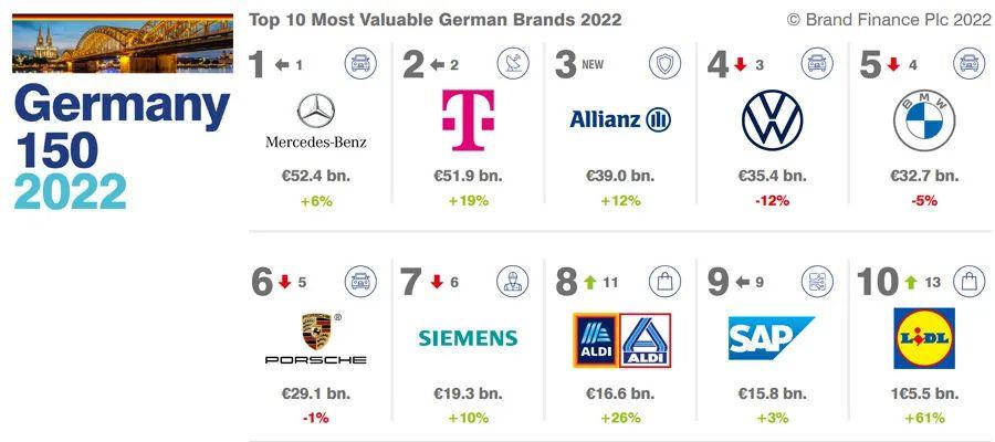 英国品牌评估机构“品牌金融”(Brand Finance)发布“2022德国品牌价值150强”榜单(Deutschland 150 2022)。梅赛德斯奔驰蝉联榜首,德国电信升至第二位,安联升至第三位。