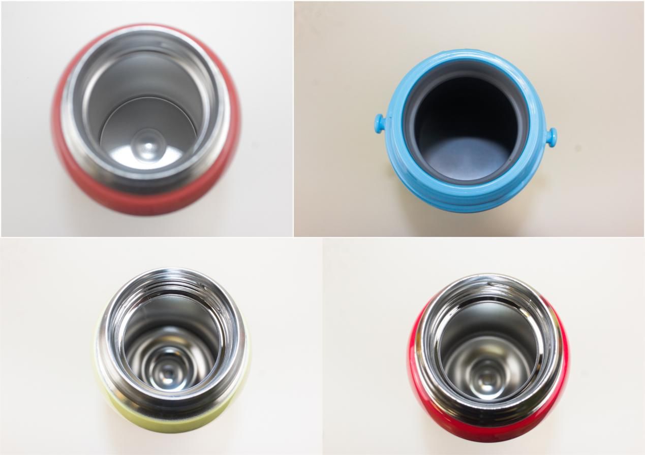 (自第一排起,由左往右分别是虎牌、象印、杯具熊和乐扣乐扣。其中象印保温杯的内壁镀了一层防粘涂层。)