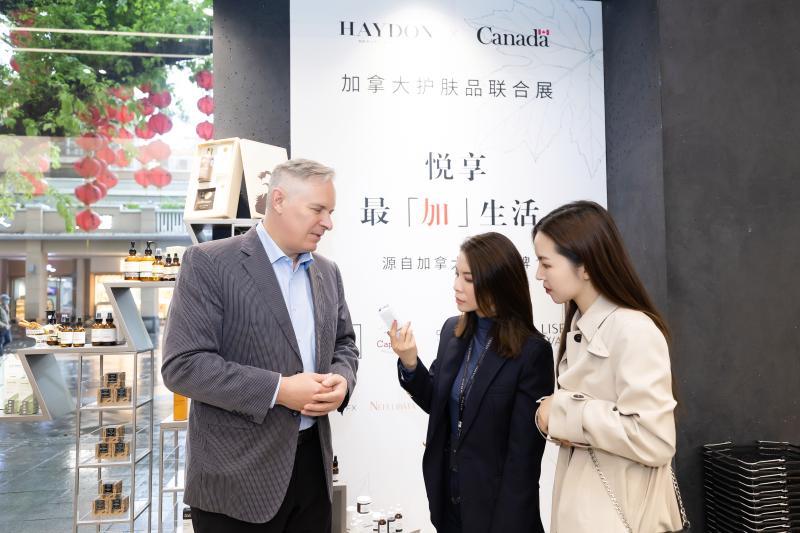 3月24日,在经过改造升级的北京路步行街上,一场加拿大本土护肤品牌限定体验联合活动在美妆零售品牌HAYDON黑洞北京路门店上演。活动现场,加拿大驻广州总领事馆总领事欧阳飞为家乡产品“打call”。在广州加快建设国际消费中心城市的背景下,来自国际的品牌们正摩拳擦掌,瞄准粤港澳大湾区庞大的消费市场。