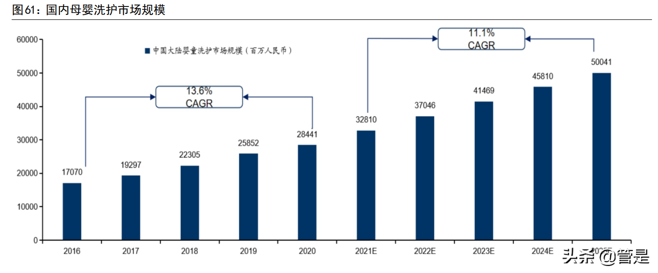 受益于母婴电商发展、品类创新升级,我国婴童洗护市场规模稳健增长。据欧睿数据显示,2020 年我国母婴洗护品市场规模达 284.4 亿元,同比增长10.0%,2016-2020 年 CAGR 为 13.61%,包括婴童和孕产妇护发、护肤、防晒、洗漱用品;由于近年来家长对母婴洗护品性、功能性等方面的要求不断增强,母婴洗护品的产品种类不断丰富,市场持续吸引新品牌入局;同时受益于线上渠道爆发带来的增量需求,以及消费力持续升级下客单价的提升,婴童洗护品市场规模有望持续扩大,预计 2021 年市场规模为 328.1 亿元,2025 年有望达到500.41亿元,2021E-2025E CAGR 约 11.1%。
