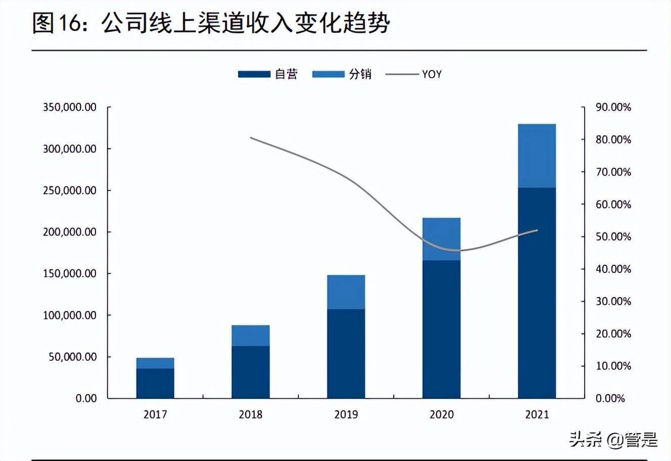公司于 2012 年设立电商事业部,开始积极拓展电商渠道。公司线上布局主要以自营模式为主,经过多年布局,公司已经建立了极为成熟的线上运营团队,在去年行业线上流量趋势发生变化情况下,公司积极调整布局,主流平台提升精细化运营的同时,积极开拓新兴平台,从而保障公司电商渠道继续实现远好于行业平均水平的增长表现。21 年公司线上销售收入比上年增长51.92%,占收入比重82.34%。