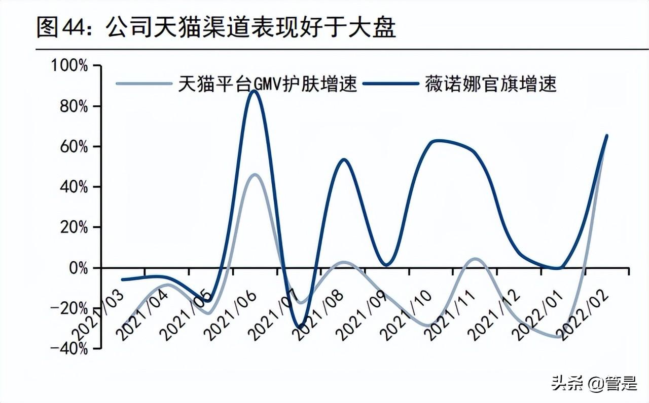具体来看,天猫平台一直是公司重点布局渠道,2017-2021 年天猫渠道销售收入占线上销售收入比例稳定在 50%以上,公司 21 年天猫平台营收增速仍达到45.6%,且在 2021 年“双 11”促销节中取得天猫美容护肤类目TOP6,是TOP10 中国货品牌,整体在渠道层面为公司增长贡献了稳定的基本盘。但同时,公司也积极顺应当前流量去中心化趋势,进行了平台多元化布局,21 年积极进军抖音、快手等新兴平台,取得良好成绩。(报告来源:未来智库)