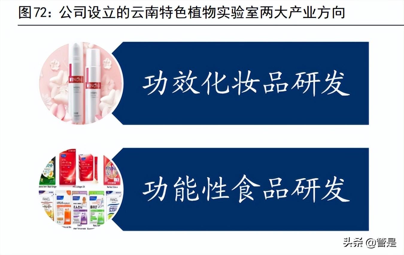 同时,公司的研发特色在于,立足于云南植物王国的地域优势,采用独特萃取科技,对云南植物成分进行筛选,提取分离出高原特色植物的有部位,建立质量标准,进行产业化并应用于自身核心产品中。而在去年底公司获云南省委、省政府以及云南省科技厅联合授予牵头建立“云南特色植物提取实验室”,该实验室将以产业化为导向,聚焦基于云南特色植物的功性化妆品、功能性食品以及药品研发。首期研发团队规模预计达 100 人,公司未来将采用“柔性+双聘”的机制引进国内外高层次科研人才,5 年后实验室研发团队规模预计达300 人。通过5-10年建设,围绕研究及产业化方向,加速突破一批产业关键核心技术,为公司丰富新的产品管线,并培育公司新的规模化增长点。