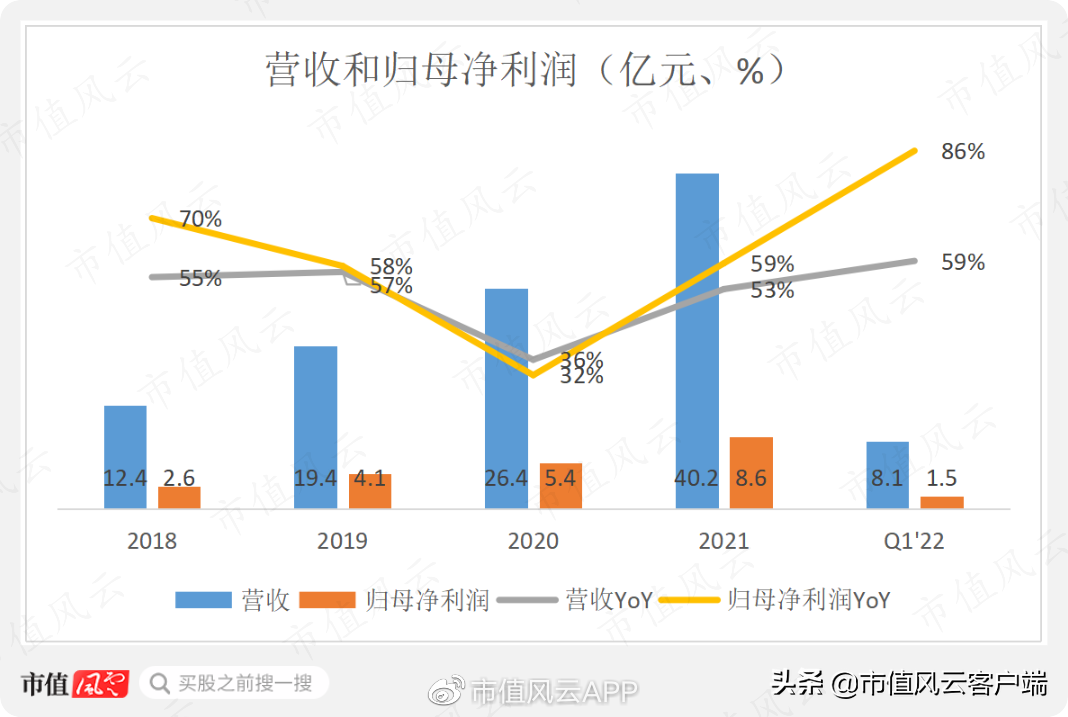 从业绩增速来看,公司的营收和归母净利润增速除2020年在30%左右之外,其他年份均在50%以上,2018-2021年CAGR分别为48%和49%,妥妥的高增长。