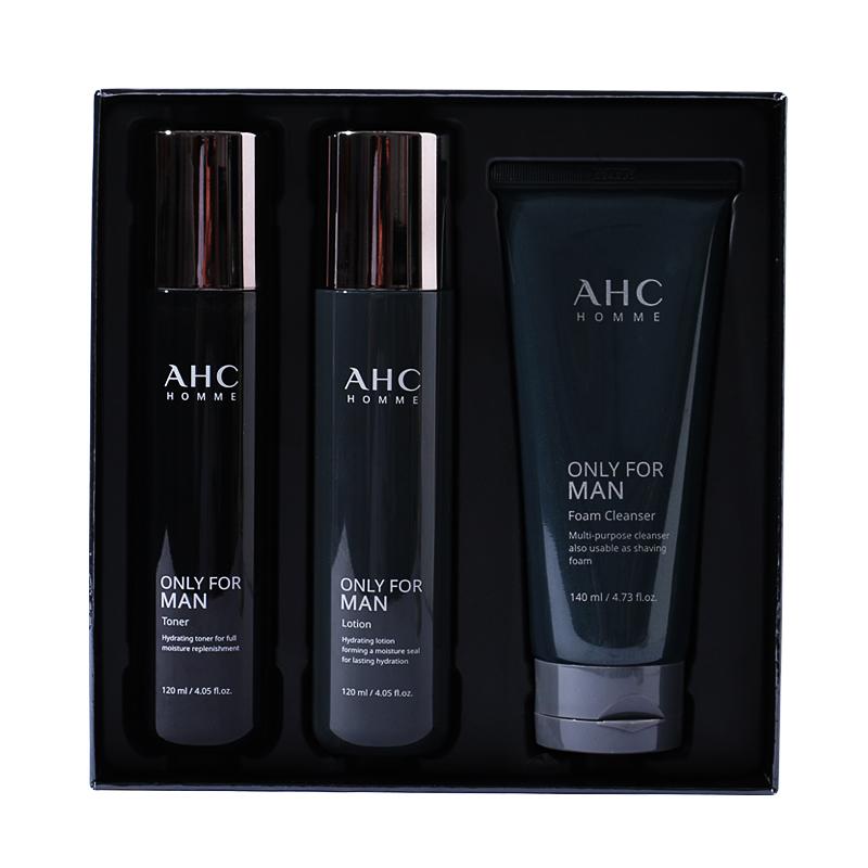ahc男士护肤品套装一共有三件,分别是洗面奶、爽肤水跟乳液。其中洗面奶泡沫丰富,可以带来软化角质层、抗痘、去黑头的果,清洗后肌肤也不紧绷;爽肤水则有提亮肤色,平衡肌肤水油性,带来深度补水的果,涂抹后清爽不粘黏;乳液则有紧致肌肤、收缩毛孔、滋润粗糙肌肤、保湿等等的功,可以给男性肌肤带来好的保湿果。