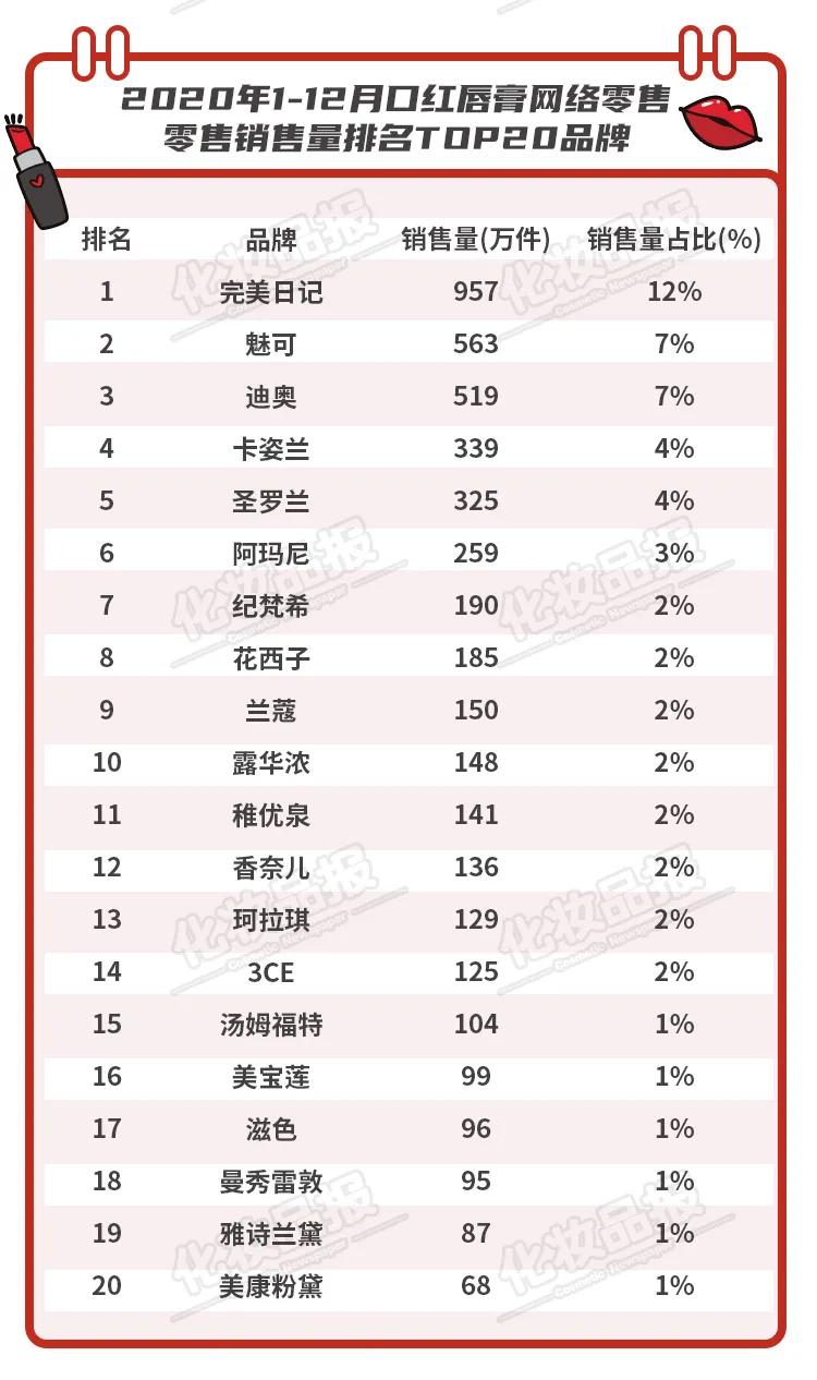 总体来看,2020年国内唇部彩妆市场尽管略有下滑,但依旧坚挺,过去一年,头部的平价国货彩妆品牌在唇部这个细分领域,已经实现了对高端国际品牌的阶段性超越。