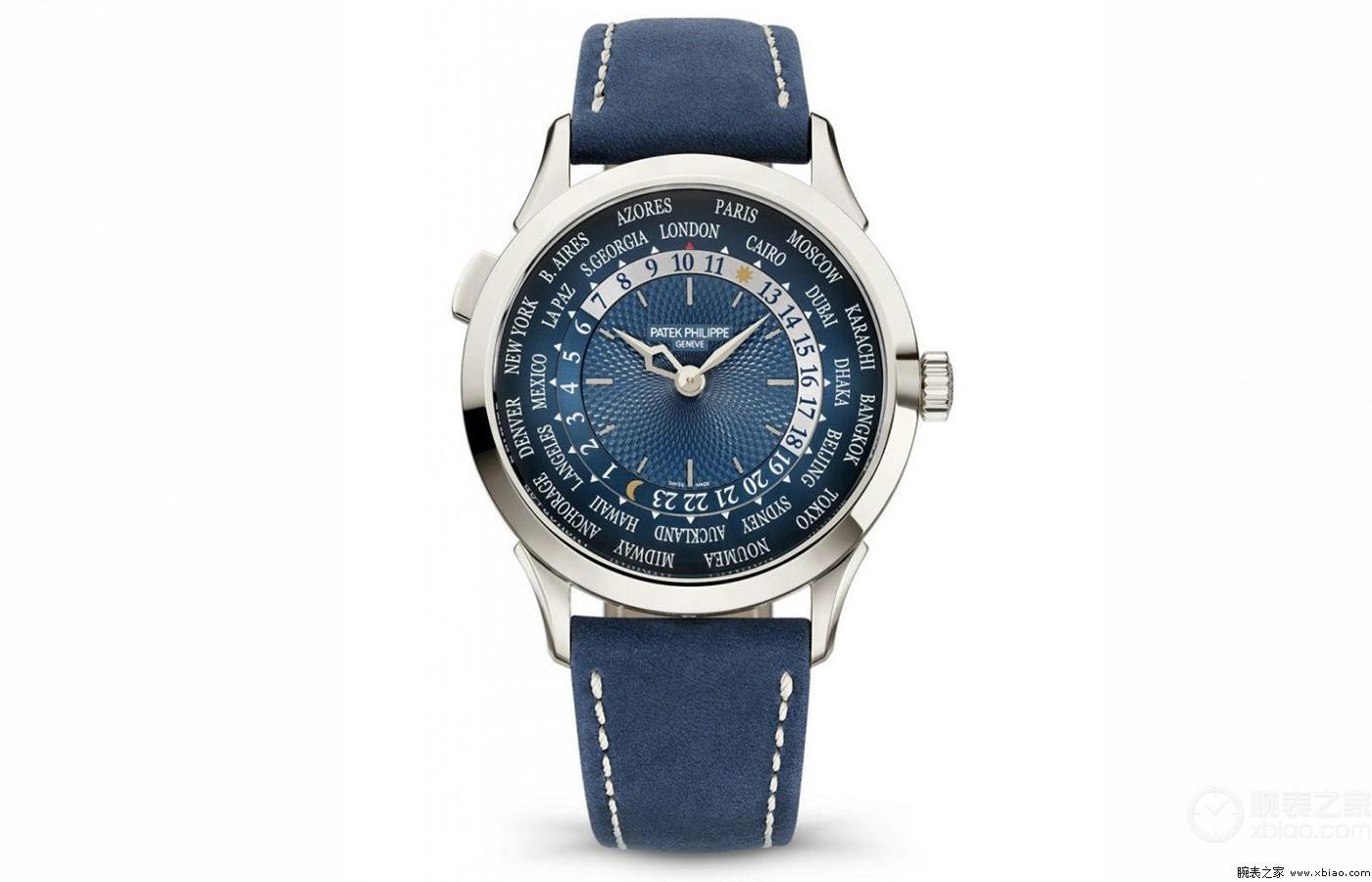 腕表点评:这只百达翡丽腕表是2022年的新品,也是采用铂金材质表壳,配以和蓝色表盘同色系的小牛皮表带。 24 个时区都设计在表盘上,一目了然。调节方法也很简单,仅需按下 10 点位的按钮,就可以以小时为单位,同步调校所有时间的显示。腕表直径38.5毫米,950铂金材质打造表壳,表盘上,有环形手工雕饰纹镶嵌。搭载百达翡丽Cal.240 HU自动机械机芯,动力储备48小时,腕表防水30米。这只腕表公价55.32人民币,不过在购买时,价格会有浮动,表友们请自行斟酌,理智购物。