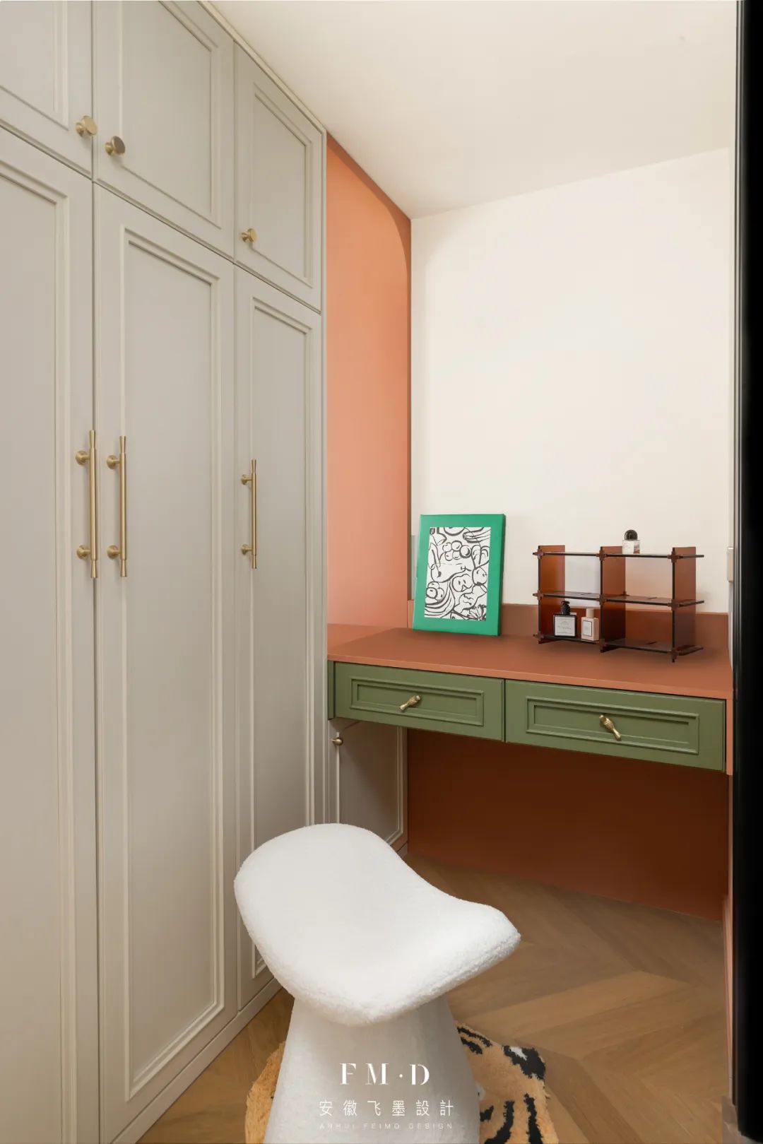 床头的梳妆台除了靠墙设计外,还可以与床头背景墙垂直设计。如下图这个家: