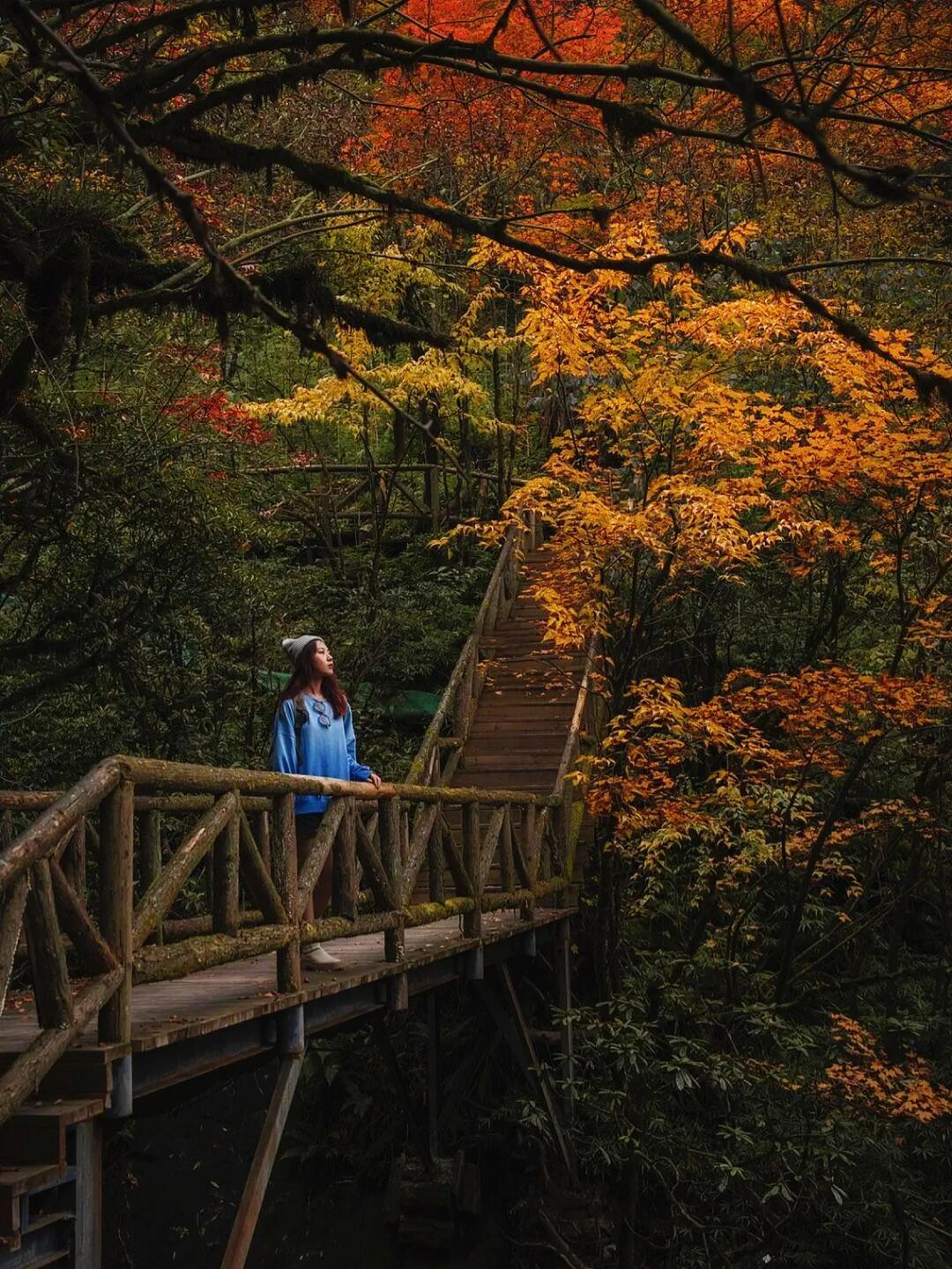 高达参天的古树有种神秘莫测的凝重之感,而多彩的系红叶却为它增添许多活力,再加上景区自带景深果的网红栈道,必定是轻松又出片的。