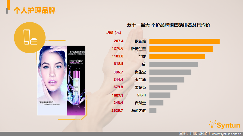 数据显示,双十一当天个护品牌销售欧莱雅销售均价只有207.4元,远低于排名第二、三的雅诗兰黛(1276.6元)、兰蔻(1103.8元),一个闯进前十的国货品牌自然堂销售均价为248.4元。
