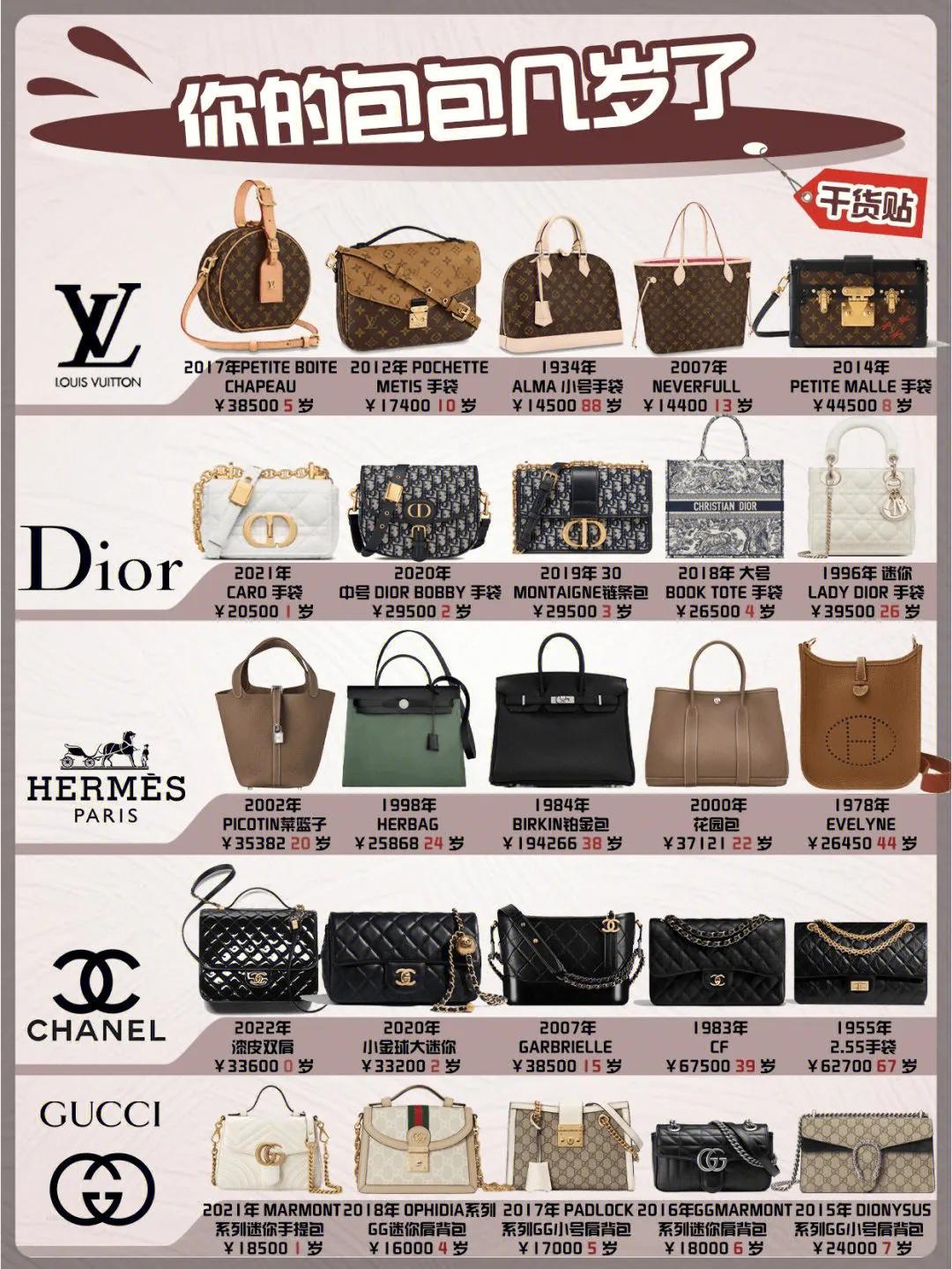 来干货了!品品牌包包的不同年份,大家快对照一下你的包包都多大了吧。有些款式真的是经历了时间的考验,有些款式也已经停产。那你的包包变成“时代眼泪”了吗?