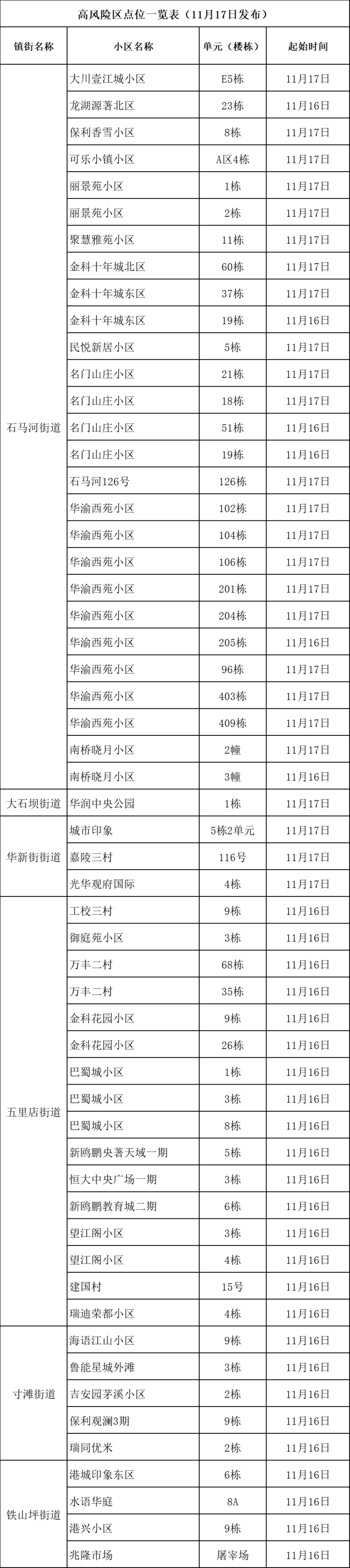 公园尚城2栋(11月14日起算),金科星辰3期1栋(11月15日起算)。二、调整高风险区具体点位(3个)