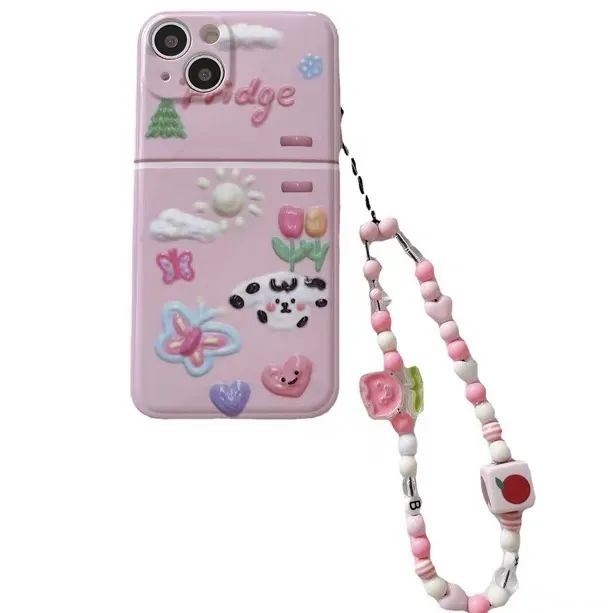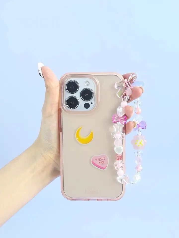 这一款的串珠就充当了腕带的功能,轻轻别于手腕处,再也不用担心手机会摔出去。晶莹剔透的爱心彩珠也太适合夏天了,五彩缤纷的活泼劲儿,氛围感一下子就有了。