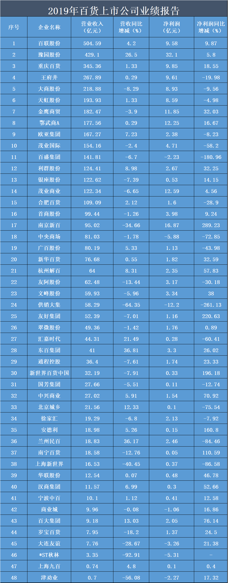 在已公布2019年财报的48家上市百货公司中,豫园股份、南京新百、茂业商业分别以32.1亿元、16.87亿元和12.59亿元净利润位列前三名。